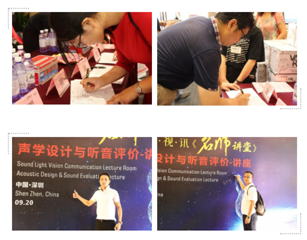 7月31日【声光视讯-名师讲堂】国家标准与听音评价方法讲座在广州成功举办,在讲座现场深装集团设计院戴院长及深圳的业内同仁就向我和陈总提议到深圳举办一个以‘声学设计’为主题的讲座;经过筹划,拟定在20号举办,并请了隋星、戴院长、邓院长、胡中明、唐军等专家老师演讲,因16号刮台风在17号下午才确定举办,结果短短两三天经过隋春立声光视讯工作室负责人/智慧音视频公司董事长陈利带领一班人的努力下今天开办了,真的是非常不容易!谢谢筹办组和陈董事长!谢谢戴院长、邓院长、胡中明、隋星、唐军等专家老师的无私奉献!谢谢钟继美、吴劲锋、吴中活等老总们的大力支持。