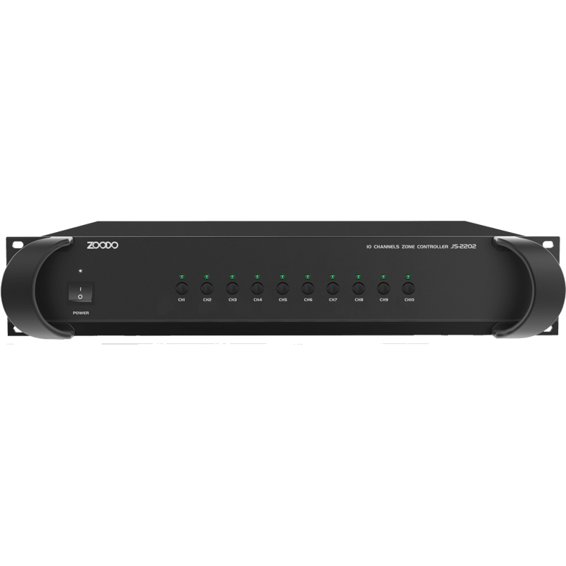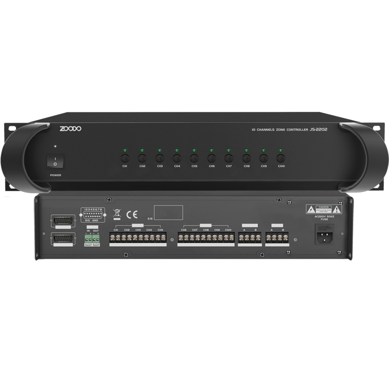 10路独立分区选择开关,分区随意切换,互不干扰;设有4路音频输入,其中2路为背景音乐节目,2路为紧急优先节目;分区工作状态用指示灯显示,铝灯为背景音乐节目,红灯为紧急优先;分区分为两组管理,A组管理1~5区,B组管理6~10区,每组输出最大功率为2000W,每个分区输出最大功率为600W;具有两种短路控制信号输入,一种为触发开启全区,一种为触发独立开启每路分区;具有两种短路控制信号输出,一种为全区短路信号输出,一种为每路分区独立短路信号输出;设备采用双继电器同时双切控制电路,道通隔离度≥80dB,解决通道之间相互串音等问题;2U标准机箱设计,铝合金面板,美观实用。箱体尺寸485*88*340mm,电源功耗为15W